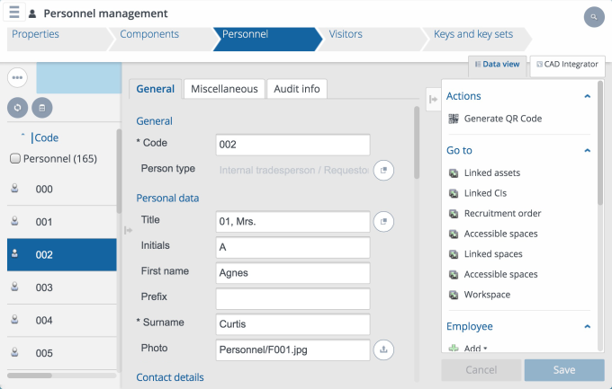 Das folgende Bild zeigt ein Modul mit allen drei Bedienfeldern (Elementbedienfeld, Datenbedienfeld und Aktionsbedienfeld) auf einem Tablet.