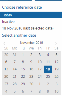• Die Schaltfläche Referenzdatum Schaltfläche: Heute ist standardmäßig ausgewählt. Mit der Option Referenzdatum auswählen können Sie ein bestimmtes Datum aus dem Kalender auswählen. Das ausgewählte Referenzdatum wird für alle Transaktionen in der Anwendung berücksichtigt.