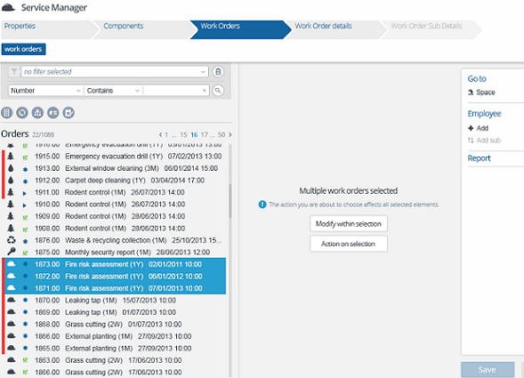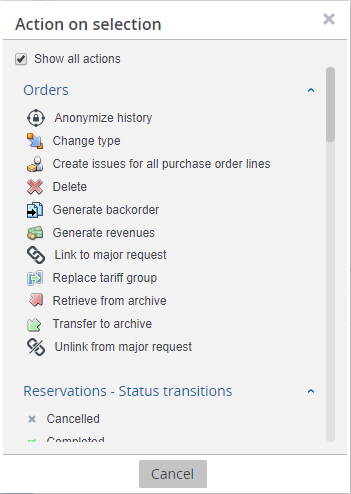 Sie können die Aktion für die Auswahl auf Elemente verschiedener Systemtypen oder benutzerdefinierter Typen anwenden, z. B. Haupt- / Unterarbeitsaufträge, Reservierungen usw.