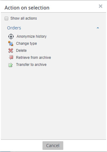 Wenn Sie Alle Aktionen anzeigen deaktivieren, werden nur die Aktionen angezeigt, die für alle Typen in der Auswahl verfügbar sind (siehe folgende Abbildung):
