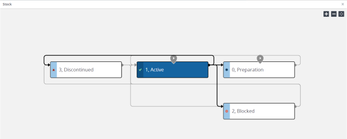 Das Statusflussdiagramm zeigt den aktuellen Status und die möglichen Übergänge eines ausgewählten Elements an. Sie können auch den oder die Anfangsstatus und die Statussymbole anzeigen. Über die drei Schaltflächen oben rechts im Bedienfeld können Sie das Flussdiagramm vergrößern, verkleinern und optimal an die Seitengröße anpassen.