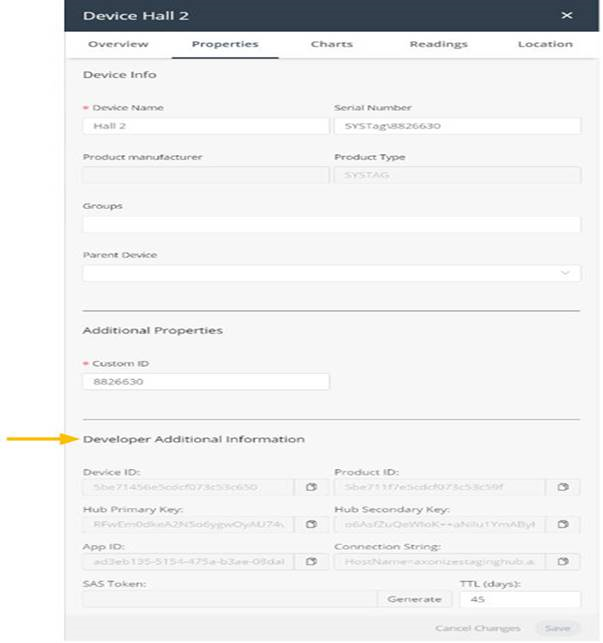 4. Copy the values in the fields in the Developer Additional Information area of this window (as described in Device Access Credentials) in the IoT Platform SDK config file to enable the device to access the IoT Platform Server.