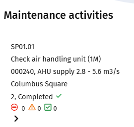 the Maintenance activities page is displayed, showing the activity details and - where applicable - checklist statuses (labelled Not assessed, Assessed with observation, Done and Unable to assess).