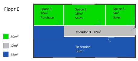Space 2 (Sales) | • (12 m2 of Corridor 0): (15 / 30 (=direct m2 on Floor 0)) x 12 = 6.0 m2 • (35 m2 of Reception): (15 / 90 (=direct m2 of Total building)) x 35 = 5.833 = 6.0 + 5.833 = 11.833 |