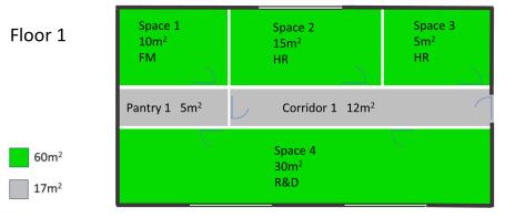 Space 5 (HR) | • (17 m2 of Pantry 1 + Corridor 1): (15 / 60 (=direct m2 on Floor 1)) x 17 = 4.25 m2 • (35 m2 of Reception): (15 / 90 (=direct m2 of Total building)) x 35 = 5.833 = 4.25 + 5.833 = 10.083 |
