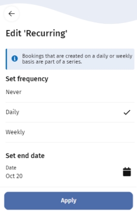 You can have a booking recur periodically, such as daily, weekly, monthly or on specified dates. This will result in a scheduled series of bookings for the selected interval.