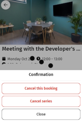 3. Select Cancel this booking to cancel the selected booking or Cancel series to cancel the entire booking series; select Close if you want to abort the operation.